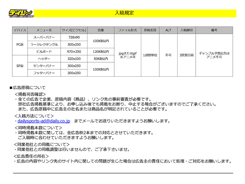 デイリースポーツオンライン広告メニューガイド ※一括ダウンロードはコチラ