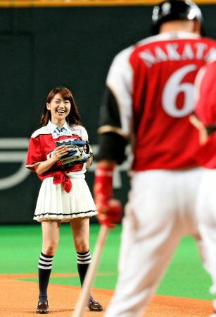 日本ハム・中田との“1球対決”で投球する「AKB48」の大島優子さん=札幌ドーム