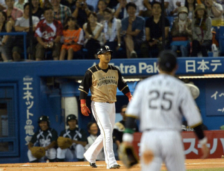6回、中田(中央)に対し2球連続で超スローボールを投じ、帽子を脱いで謝る全セ・藤浪(左)=神宮