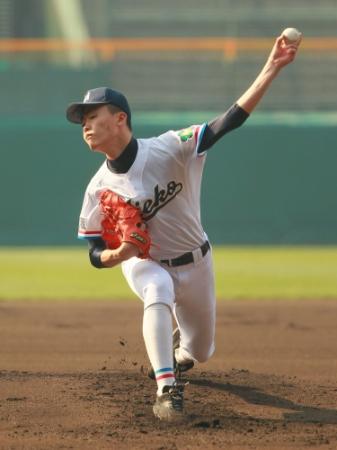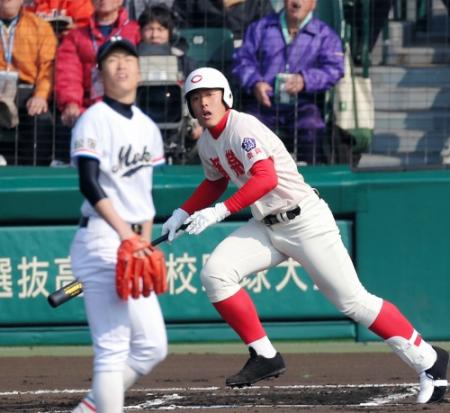 6回、本塁打を放った智弁学園・岡本はベンチに向かって拳を突き上げる=甲子園(撮影・神子素慎一)