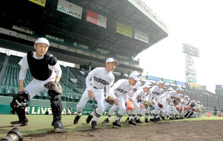 出場校による甲子園練習が17日行われ、21世紀枠で大会最長ブランクとなる82年ぶり出場の松山東(愛媛)が登場した。前回出場時や、松山商との統合で全国制覇した1950年夏と同じ、胸の文字がアーチ型の“復刻ユニホーム”を初披露。ナインは30分間、緊張の面持ちで聖地の感触を確かめた。
