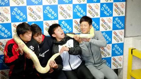 まずは琉球の伝統衣装に身を包んで三線教室に入門。さらに、幸運の白蛇を首に巻いて大興奮。ドラフト1位の東は「蛇にチューをしたんですけど、その感触がまだ残っています。硬かったです」と苦笑いだった。