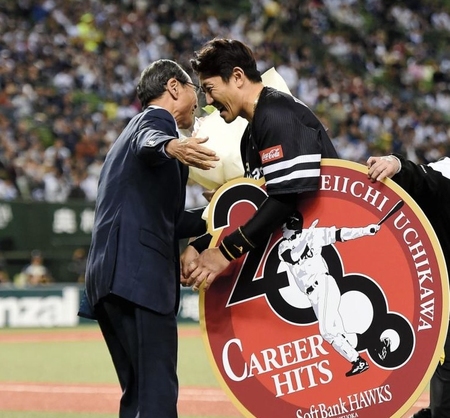 西武の松井稼頭央から花束を贈られた内川は、2000安打の記念パネルを掲げてファンの大声援に応えると、王貞治球団会長とがっちり握手。代走を送られてベンチへ下がると、工藤公康監督やナインにハイタッチで迎えられた。
