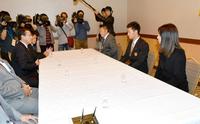契約に合意し、チョコレートを口にする藤原