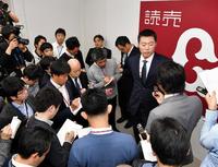 会見で唇をかみ締め、決意を新たにする巨人・上原浩治=東京都千代田区の球団事務所(撮影・出月俊成)