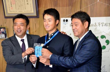 緊張した面持ちで握手を交わしたが、長谷川スカウト部長から「(原)監督の若い頃に似てるよね」と指摘されると思わず笑顔。同監督からの直筆サイン入りカードも受け取り、決意を新たにした。