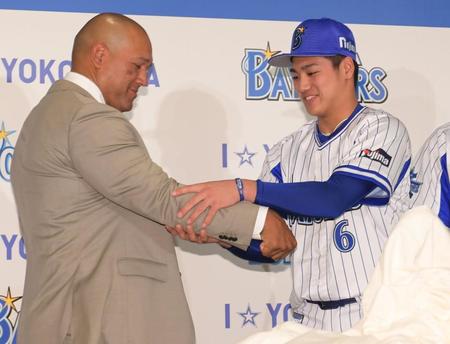 DeNAのドラフト1位・森敬斗内野手(17)=桐蔭学園=が22日、新人選手5人と共に横浜市内のホテルで新入団選手記者発表会に臨んだ。色紙にしたためた文字は造語の「泰銘」。高校の先輩で、ロッテから楽天へFA移籍が決まった鈴木大地のように、ファンから愛される選手になることを誓った。