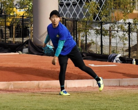 DeNA・今永昇太投手(26)が14日、母校の駒沢大学野球場で自主トレを公開。珍しいエメラルドグリーン色のグラブを使用し、今年初のブルペン投球を行った。