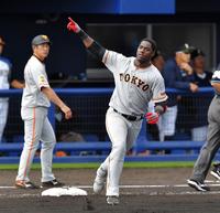 8回、ソロ弾を放ち笑顔でナインとタッチするモタ(左)=撮影・高石航平
