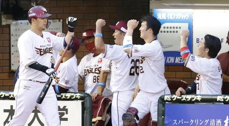 まずは4番・浅村。二回の先頭打者として登場。日本ハム先発のマルティネスの初球、147キロの直球を強振。右翼席に飛び込む1号ソロで先制した。