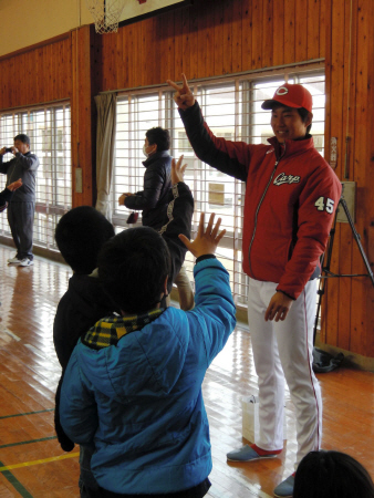 生徒とじゃけん大会やキャッチボールでふれ合った。塹江は「プロとして初めてのキャンプを、1日1日を楽しく頑張れば良い1年になるのでは、と考えています。皆さんも1日1日を楽しんで、一緒に頑張りましょう」とあいさつ。13日からの次クールへ、決意を新たにしていた。