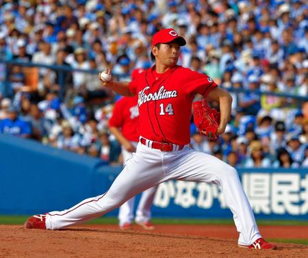 8回を三者凡退に抑えた広島・大瀬良大地=横浜スタジアム(撮影・吉澤敬太)