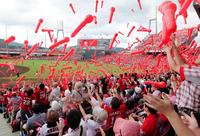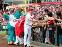 今季6勝目を挙げ、小さな“カープ女子”の祝福に笑顔を見せる広島・前田健太(左・後ろは広島・大瀬良大地)=マツダスタジアム(撮影・出月俊成)