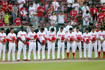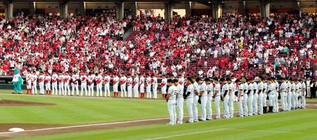 全員が統一背番号のユニホームを使用するのは、セ・リーグの公式戦では初めて。試合開始前には両軍がベンチ前で黙とうをささげた。