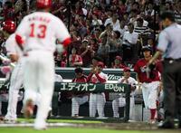 3回、押し出しの四球を与え、降板を告げられる巨人・ポレダ(右から2人目)とじっと見つめる巨人・坂本勇人(同3人目)=マツダスタジアム(撮影・出月俊成)