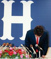 ドジャース移籍決定後、初めて広島で会見する広島・前田健太=マツダスタジアム(撮影・吉澤敬太)