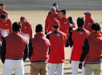 臨時コーチとしてキャンプに合流し投手陣にあいさつする安仁屋宗八=日南市天福球場(撮影・持木克友)