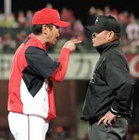 7回、小窪の一塁アウトの判定を巡り抗議、退場処分となった広島・緒方監督=マツダ