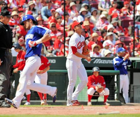 初登板初先発となった広島の右腕、中村祐太投手は5回3失点で勝利投手の権利を持ってマウンドを2番手の中田に譲った。