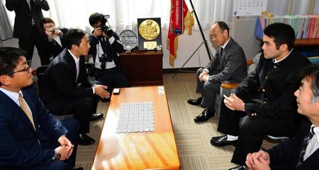 広島からドラフト4位指名された永井敦士外野手(17)=二松学舎大付=が1日、都内の同校で高山スカウト、尾形スカウトから指名あいさつを受けた。