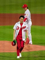 鯉党・谷原章介が背番「14」で始球式 G坂本勇主将を“襲う”暴投