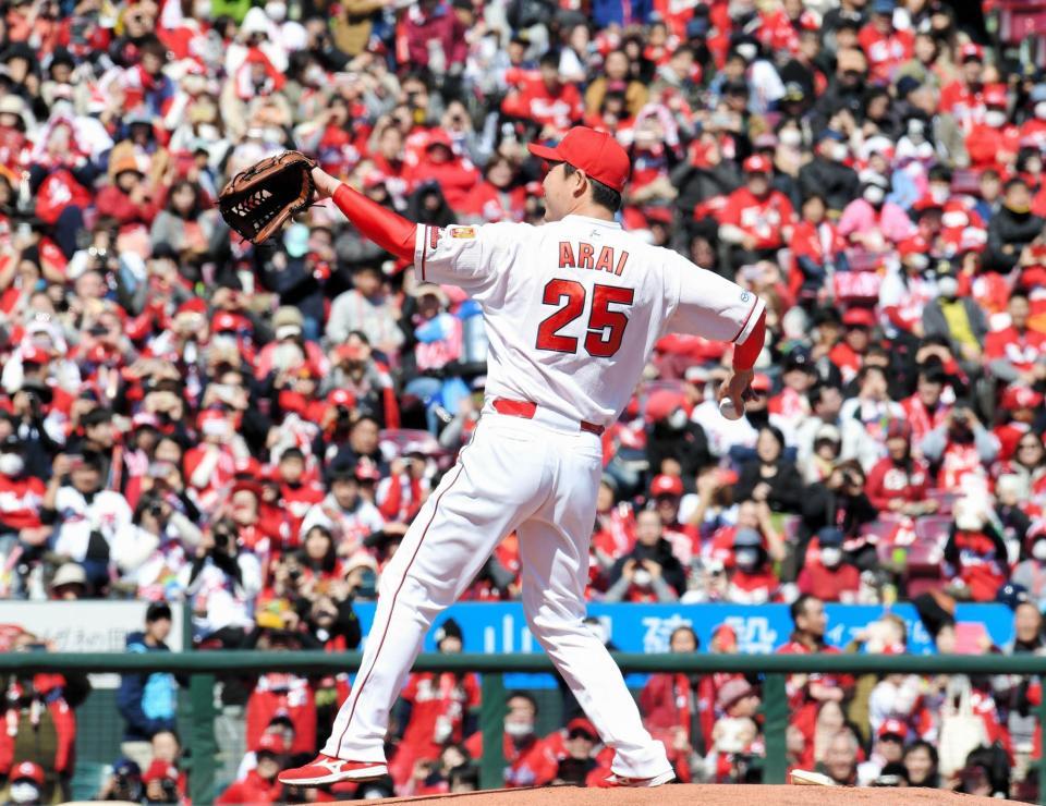 新井貴浩氏が始球式 愛息2人が打席に立つ中ノーワインドアップで
