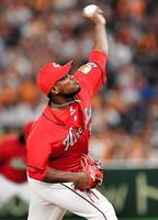 8回を無失点に抑え、天を仰ぐ広島 ヘロニモ・フランスア=東京ドーム(撮影・西岡正)