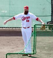 広島スコットが捕手におじぎ「感謝するため」DJ・ジョンソンと上々フリー打撃初登板