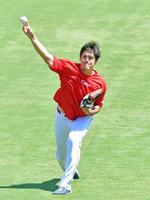 登板へ向けて調整する広島・九里(撮影・立川洋一郎)