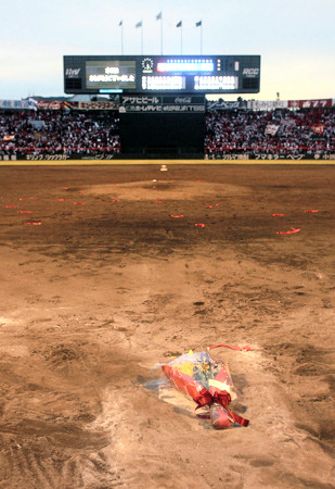 公式戦最後となる広島市民球場。試合後、本塁上には花束が置かれた