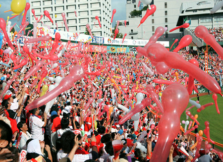 風船を上げて応援する広島ファン。このジェット風船も市民球場から始まった