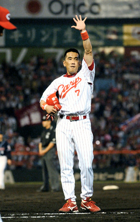 四回、左前打を放ち2000本安打を達成、ファンの声援に応える野村=2005年6月23日