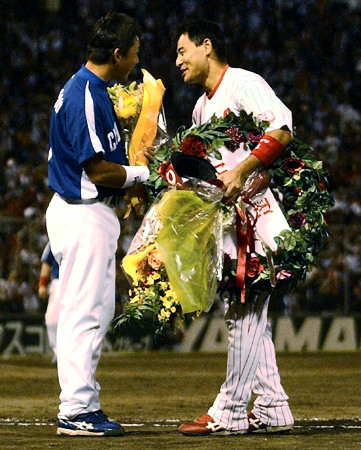 2000安打を達成した前田(右)は中日・立浪から祝福の花束を受け取る=2007年9月1日