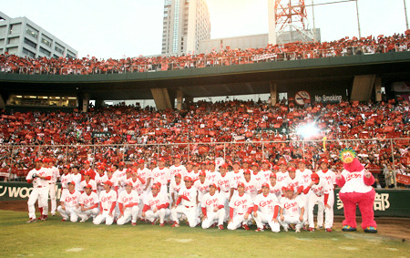 公式戦最後となる広島市民球場。真っ赤に染まったスタンドをバックに記念撮影に収まる広島ナイン