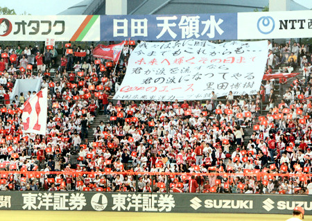 試合前、黒田へのメーセージを書き込んだ横断幕を掲げるライトスタンのファン=2006年10月14日