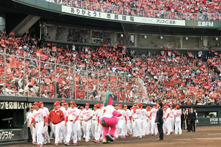 公式戦最後となる広島市民球場。真っ赤に染まったスタンドをバックに広島ナインは場内を一周した