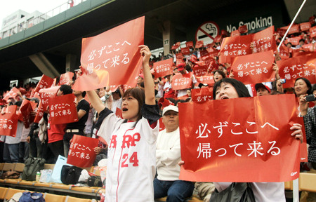 市民球場での日本シリーズを願い、メッセージを掲げるカープファン