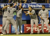 42歳の反骨心が怒濤(どとう)の逆転劇を呼びこんだ。目慣らしは1打席で十分。そう言わんばかりに、剛腕を打ち砕いた。2点を追う七回。金本が特大二塁打を放ち、ビッグイニングの口火を切った。芯に乗せたのは由規の152キロ。外の速球に腕を伸ばした打球がジャンプした青木のグラブをかすめ、右中間フェンスを直撃した。初回2死満塁の好機で低めの156キロに三振を喫した汚名を返上。6番の快音が号砲となり、終盤までつながりを欠いた虎の強力打線が、一気に火を噴いた。