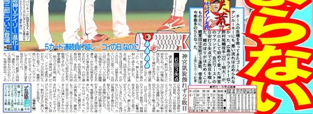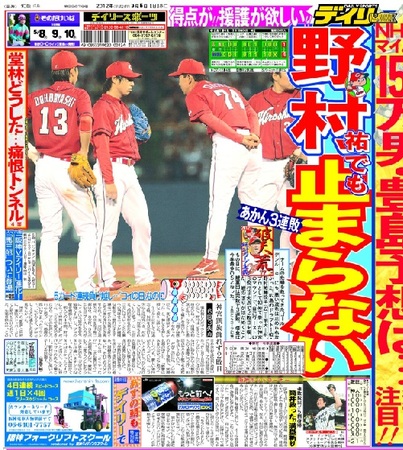 「チームの危機を救ってきたゴールデンルーキーにも、悪い流れは止められなかった。広島のドラフト1位・野村祐輔投手(22)=明大=が、プロとして初めて登った神宮のマウンドで、自己ワーストの8案だ3失点で2敗目を喫した。鯉のぼりがはためくこどもの日に、鯉軍団は完敗で3連敗。借金は今季最多の5となった。」