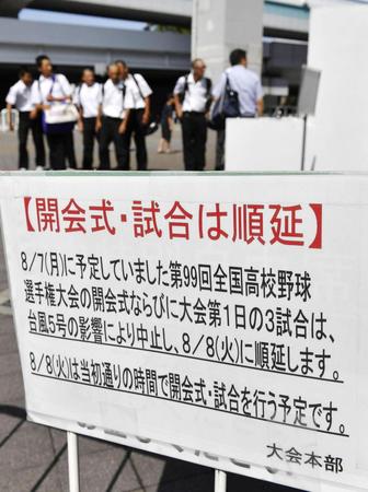 第99回全国高校野球選手権大会は7日、開会式と1回戦3試合を行う予定だったが、台風5号の接近で荒天が予想されるため8日に順延となった。