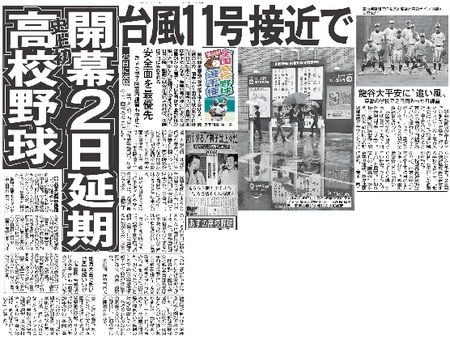 第96回全国高校野球選手権大会は9日、悪天候のため、開会式と1回戦3試合が2日後の11日に延期となった。開会式の2日間延期は史上初となる。台風11号の接近により9日は早朝から大雨で、10日も回復する可能性が低いと判断した。日程はそのまま2日延びて、11日以降、順調に試合が消化されれば、決勝は25日に実施される。