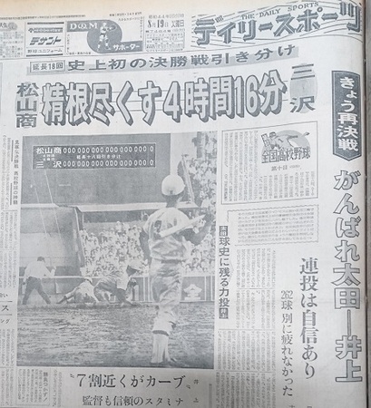 第51回大会決勝は高校野球の歴史に残る伝説の一戦となった。三沢(青森=北奥羽代表)と松山商(愛媛=北四国代表)のエース同士の投げ合いは、太田幸司(三沢)と井上明(松山商)のどちらも失点することなく延長18回を投げ切り、史上初の決勝戦引き分け再試合となった。三沢は延長15回ウラ1死満塁3ボール0ストライクと、押し出しサヨナラまであと1球まで迫ったものの無得点。16回ウラにも同じく1死満塁でスクイズ失敗併殺と好機を生かせなかった。