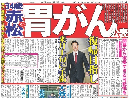 赤松が胃がん公表 健康診断で発覚「夢にも思わなかった」 復帰目指し来月手術