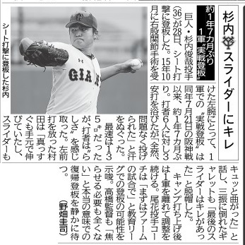 巨人、杉内スライダーにキレ 約1年7カ月ぶり1軍“実戦登板”