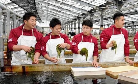 楽天の新人10選手が、キャンプ休日の4日、久米島海洋深層水開発(株)で海ぶどうの養殖を体験したり、採れたての海ぶどうの試食を行った。