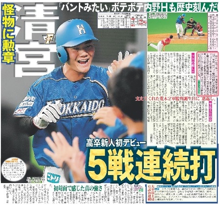 日本ハムのドラフト1位・清宮幸太郎内野手(18)=早実=がロッテ戦の初回に三塁内野安打。ドラフト制後の高卒新人では史上初となるデビュー戦からの5試合連続安打とし、母校・早実の大先輩、荒木大輔2軍監督(54)の誕生日を祝った。