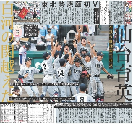 決勝が行われ、仙台育英が初優勝した。1915年に第1回大会が開催されてから107年。東北勢としても春夏通じて初の甲子園優勝となり、深紅の大優勝旗の「白河の関越え」を果たした。