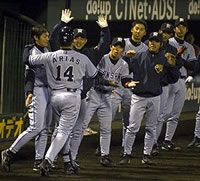 | これぞ阪神理想の勝ちゲームだ。4番・浜中に今季初アーチが生まれ、そしてエース・井川慶投手(23)が広島を4安打に抑えて完投勝利。開幕戦で苦杯をなめた男が、登板2戦目で力強く今季の第一歩を記した。これで2カード連続勝ち越し。投打の両輪がかみ合った阪神、やはり強いゾ。