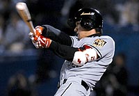 「久しぶりですね。最近、納得できないバッティングが目立ってたので…」。宿舎では、田淵チーフ打撃コーチと何度もビデオでフォームチェック。その努力の成果に、安堵の表情を浮かべた。初戦を発熱のためにスタメン落ち。指揮官から言外に叱責された。この5号ソロは、信頼を置いてくれる監督に対する償いの一撃でもあった。