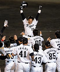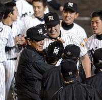 「しびれたねえ」と感動の星野監督と先発の伊良部が桧山を祝福 |